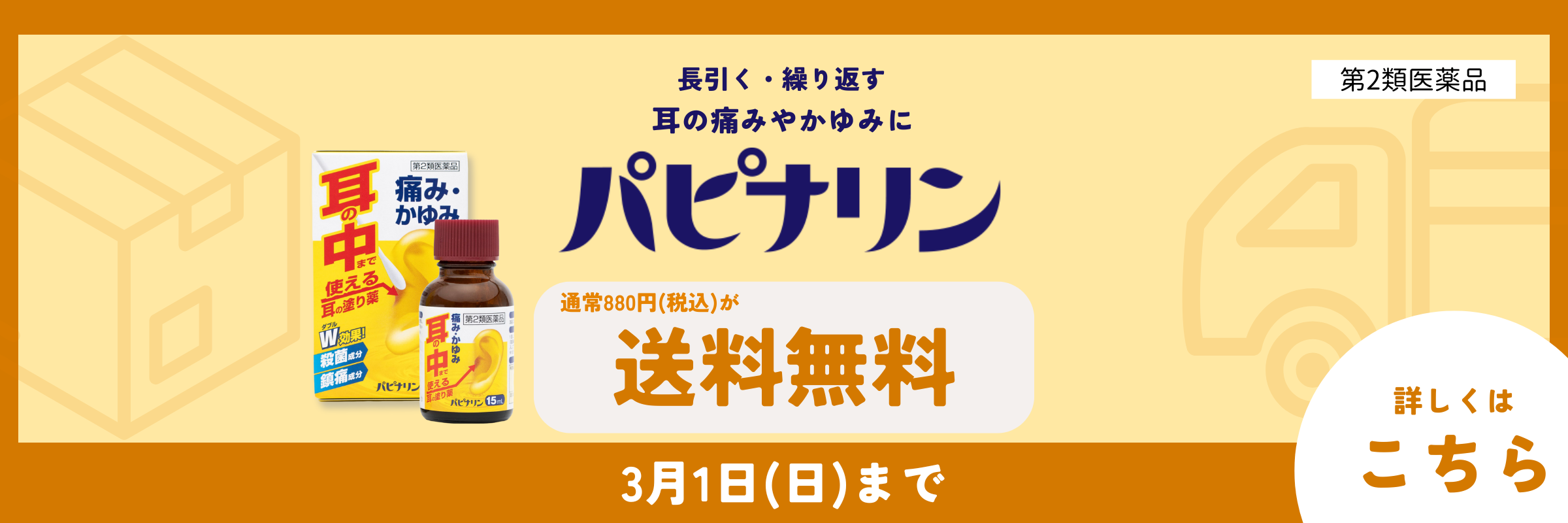 いつも当社通販サイトをご利用いただき誠にありがとうございます。 毎回大好評の送料無料キャンペーンが今年も帰ってきました!通常は全国一律880円(税込)の送料を頂戴しておりますが、 期間中は日本全国どこでも送料無料でお届けいたします。 TV CMでおなじみの耳のお薬、 パピナリンをお得にお試しいただけるチャンスをお見逃しなく!
